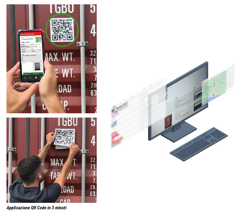 Adhesive sticker or metal plate with QR code containing encrypting data visible only by the application. These can be installed and then registered or integrated with the original container code in less than 3 minutes by any operator authorized by the owner.
